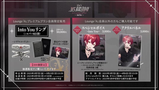 シルバーリングは、ファンクラブ プレミアムプラン会員限定かつシリアルコード付の数量限定グッズとなっています。スペシャルボイスには、ボイス購入者だけが楽しめるシークレットビジュアルとバースデー記念のキービジュアルの壁紙2種が、シルバーリングにはシルバーリングを手にした人だけが聴ける<スペシャルボイス~Into You~>の 「アナザーストーリー」を収録したボイスカードが特典としてついてきます。