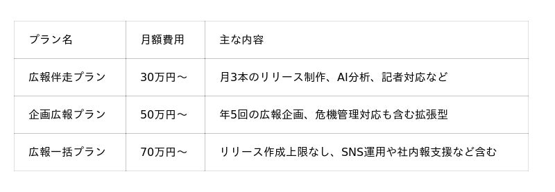 広報の専任人材がいない企業や、PR会社への外注コストに悩む企業に向けて、月額30万円~というリーズナブルな価格で、報道獲得につながる高品質な広報活動を行います。