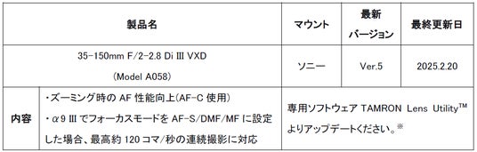 総合光学機器メーカーの株式会社タムロン(本社:さいたま市)は、タムロン「35-150mm F/2-2.8 Di III VXD (Model A058)」ソニー Eマウント用のレンズファームウェアがアップデートしますことをご案内申し上げます。