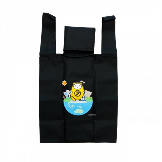 べあ~君のイラストがデザインされた、持ち運びに便利な黒色のエコバッグです。使わないときはコンパクトに折りたたんで収納できるので、カバンの中に入れておけば、急なお買い物にも安心です。シンプルながらも可愛いデザインで、日常使いにぴったりです。