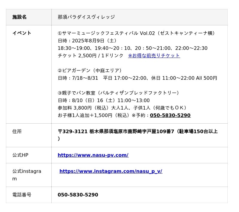 この夏、特別な体験”を――。那須高原の大自然に囲まれた「那須パラダイスヴィレッジ」では、サマーミュージックフェスティバル、開放的なビアガーデン、親子で楽しむパン教室など、グルメ・体験・音楽が楽しめるイベント目白押しです。