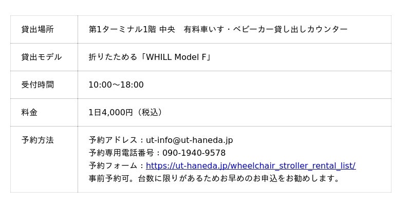 WHILL株式会社(本社:東京都品川区、代表取締役社長CEO:杉江理、以下「WHILL社」)は、羽田空港 第1ターミナル1階において、免許不要で歩行領域を走行可能な近距離モビリティWHILL(ウィル)の貸出サービスが提供開始されたことを発表いたします。NPO法人バリアフリーネットワーク会議(以下「バリアフリーネットワーク会議」)との連携事業の一環で、那覇空港や福岡空港、新石垣空港などに続くものです。多様かつ幅広い世代、インバウンドからの旺盛な旅行需要、それに伴うインクルーシブな対応機運の高まりを背景に、ウィル活用を通じて、あらゆる人が日本を満喫しやすい移動環境の整備拡充に貢献いたします。