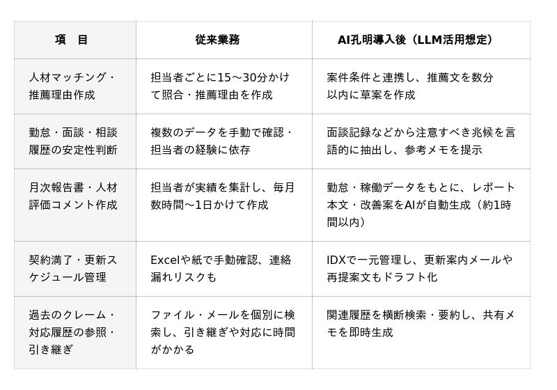 →勤怠管理・稼働データとの連携で、派遣先企業向けの報告書や稼働傾向コメント、改善提案文をAIが下書き