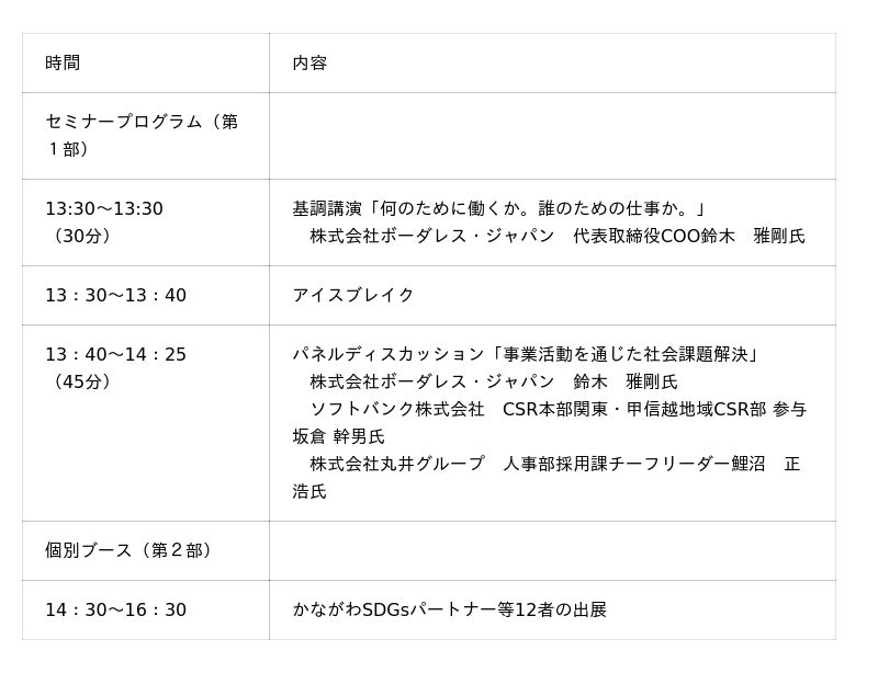 イマジネーション株式会社/大浩ホールディングス株式会社(大浩グループ)/生活協同組合パルシステム神奈川/株式会社デコリア/日本ダスト株式会社/株式会社ボーダレス・ジャパン/株式会社丸井グループ/株式会社メディカルケアシステム/薬糧開発株式会社/公益財団法人横浜YMCA/「学生と企業の交流会」プロジェクト※/神奈川県庁