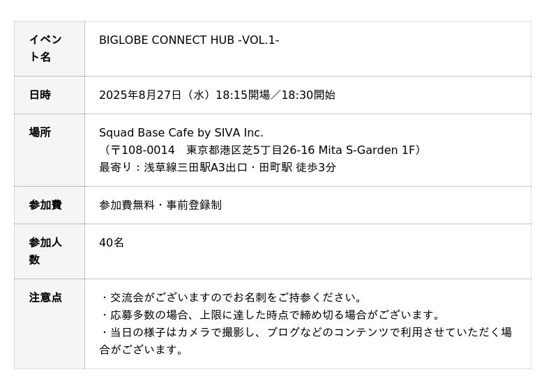 このたび、弊社株式会社トラスクエタは、ビッグローブ株式会社、株式会社Squadと共催で、アフィリエイト広告の最前線をテーマにしたセミナー&交流会「BIGLOBE CONNECT HUB -VOL.1-」を2025年8月27日(水)に開催いたします。