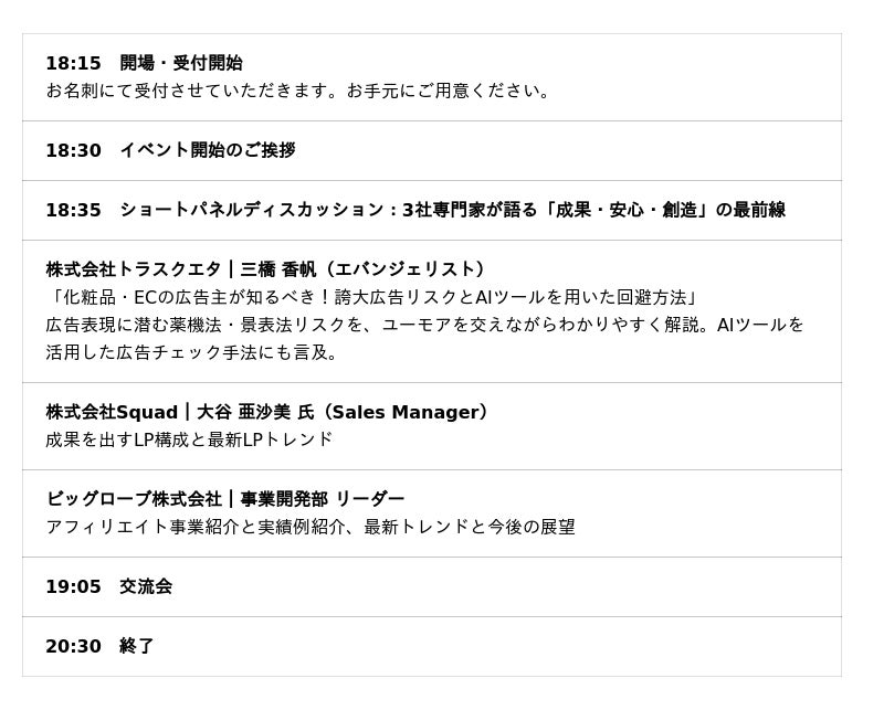 化粧品・ECの広告主が知るべき!誇大広告リスクとAIツールを用いた回避方法(トラスクエタ)成果を出すLP構成と最新LPトレンド(Squad beyond)アフィリエイト事業紹介と実績例紹介、最新トレンドと今後の展望(ビッグローブ)という3社3様の視点から、実務に役立つ運用改善の勘所を深堀りします。 また後半には、登壇者と参加者同士で直接対話できるネットワーキングの時間もご用意。“知れるだけでなく、つながれる”イベントとして、リアル会場ならではの交流もお楽しみください。