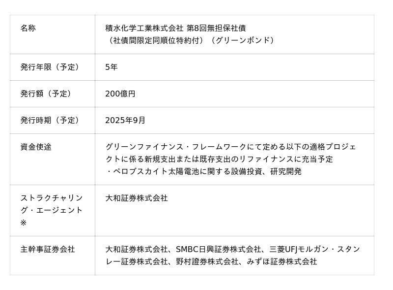 積水化学工業株式会社(代表取締役社長:加藤 敬太、以下「積水化学」)は、サステナブルな社会の実現に向けた取り組みを加速するため、サステナビリティ貢献製品の提供を強化するとともに、同取り組みについて幅広くステークホルダーの皆さまに周知し、資金調達面からも推進することを見据え、積水化学初のグリーンボンド(以下「本社債」)の発行を2025年9月に予定していることをお知らせいたします。