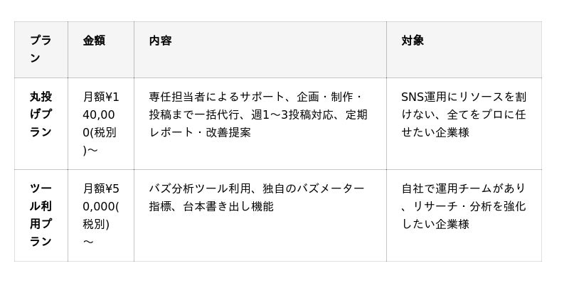 独自のツール活用による業務効率化を徹底することで、高品質なサービスを業界最安値レベルの月額14万円からという価格で実現しました。これまでコストを理由に本格的なSNS運用を諦めていた企業様にも、気軽に始めていただける料金プランです。もちろん、自社で運用リソースがある企業様向けに、分析ツールのみをご利用いただける月額5万円~のプランもご用意しています。