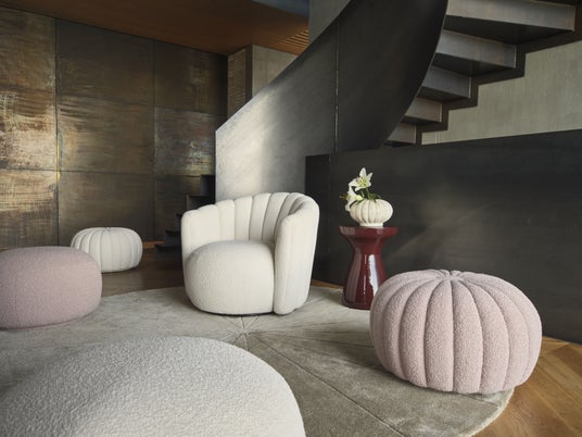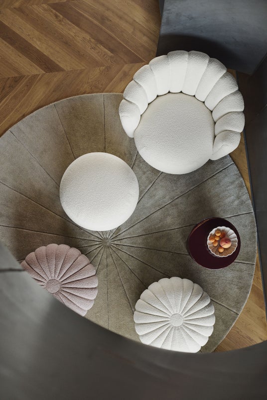 インテリアデザインの世界で根強い人気を誇るブークレ素材。本コレクションでは、新たにポリエステルブークレ「Rimini」を採用し、上質なテクスチャーと心地よい風合いを実現しました。アームチェアはホワイトブークレのみの展開。時代を超えて愛されるエレガントな仕上がりです。プーフはホワイトブークレに加え、限定カラーのブロッサムブークレの2種類からお選びいただけます。柔らかくフェミニンな印象を加え、コレクションの有機的なフォルムや繊細なディテールを際立たせます。