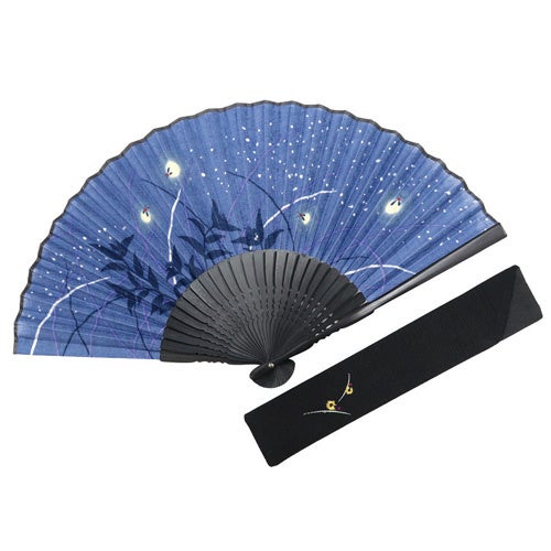 深みのある黒染めに、夜空に舞う蛍を思わせる繊細な柄が涼やかな印象を与えます。さらりとした心地よい風を届けてくれ、実用性と美しさを兼ね備えた夏の贈り物に最適です。