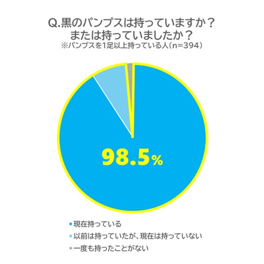 さらに、パンプスを1足以上持っていると回答した女性の9割(98.5%)が「黒パンプス」を持っているまたは持っていた経験があり、数あるパンプスの中でもベーシックなブラックカラーは、1足は持っておく必要があるものとして需要が高いことが伺えます。