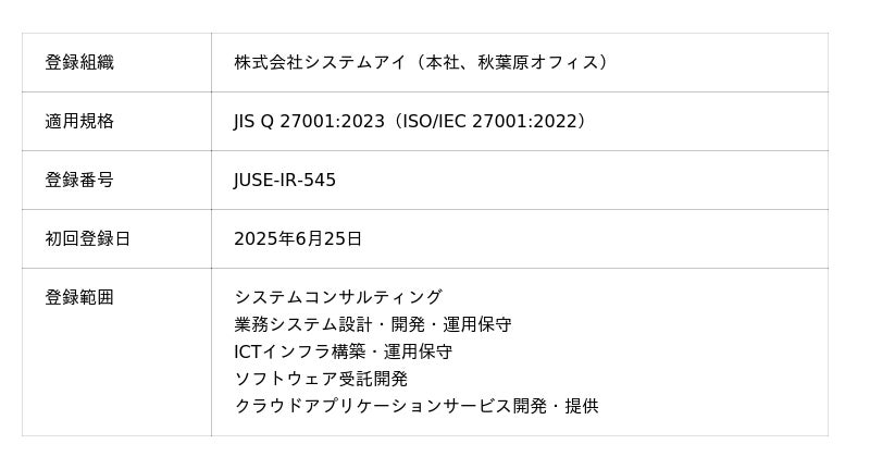株式会社システムアイ(本社所在地:神奈川県横浜市、代表取締役社長:葛川 敬祐)は、この度、ISMS(情報セキュリティマネジメントシステム)の第三者認証基準である国際規格「ISO/IEC 27001:2022」及び国内規格「JIS Q 27001:2023」の認証を2025年6月25日付けで取得いたしましたのでお知らせします。