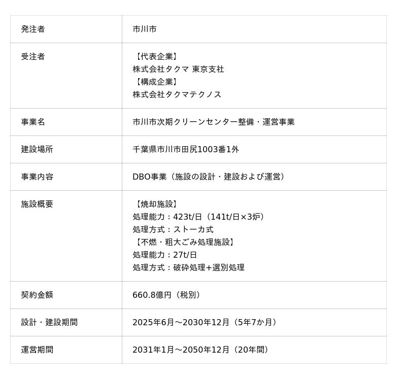 株式会社タクマ(本社:兵庫県尼崎市、社長:濱田州朗)を代表とする企業グループは、本年6月19日、千葉県市川市から、ごみ処理施設のDBO事業※1(以下「本事業」)を受注しました。焼却施設および不燃・粗大ごみ処理施設を新設し、2031年1月から20年間の運営を行います。本事業では、国内最高レベルの発電効率によるごみ発電システムを導入します。また、市川市におけるカーボンニュートラル推進のシンボル施設となるよう、クリーンエネルギー創出の取り組みを視覚的に伝える建屋デザインを採用します。