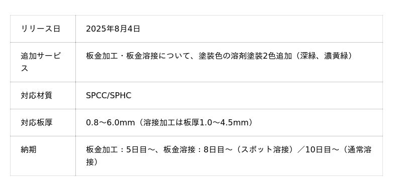 機械部品調達のAIプラットフォーム「meviy(メビー)」(サービス提供元:株式会社ミスミグループ本社)は、8月4日より、板金加工および溶接加工(以下、板金溶接)の塗装色に「深緑」と「濃黄緑」の2色を新たに追加します。鮮やかな色味を実現するため、今回も高彩度な調色が可能な「溶剤塗装」を採用。これにより、溶剤塗装のラインアップは従来の5色から7色へと拡充され、meviy全体で提供する塗装色は合計22色となり、お客さまの多様なニーズにより柔軟に対応できるようになりました。