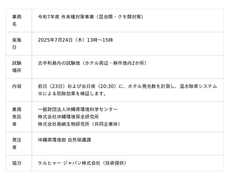 今回の試験は、沖縄県環境部自然保護課の委託事業「令和7年度 外来種対策事業(昆虫類・クモ類対策)」の一環で実施されたものです。薬剤を使わず高温水のみでホタルの個体数を抑制する新たな環境ソリューションとして、効果検証が行われました。