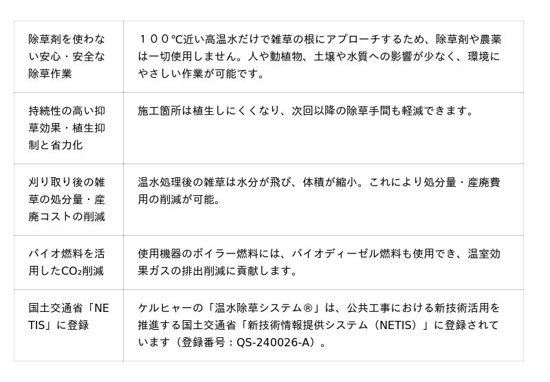 温水除草は、100℃近い高温水を雑草に散布することで、雑草の根のタンパク質構造を変異させ、 根から枯らす方法です。薬品(除草剤、農薬)を使用しないため、人体や農作物、家畜に与える影響もなく、安全で環境に優しい除草作業を実現します。ケルヒャーは、除草に最適な温度を維持する機能がある温水高圧洗浄機に、専用ノズルと組み合わせることで、「温水除草システム(R) 」を開発し、2022年にケルヒャー ジャパン株式会社が商標を取得しました。