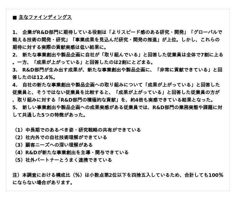 本調査は、「今までにない新たな事業創出や製品企画」に取り組む企業の実態と、取り組みにおけるR&D部門の貢献状況や抱える課題感を把握することを目的に実施しました。その結果、取り組みの成果が上がっていると感じている企業ほど、R&D部門が中心となって取り組みを主体的にリードしている実態や、成果の出ている企業におけるR&D部門の特徴などが明らかになりました。本調査で得られた主なファインディングスは次のとおりです。