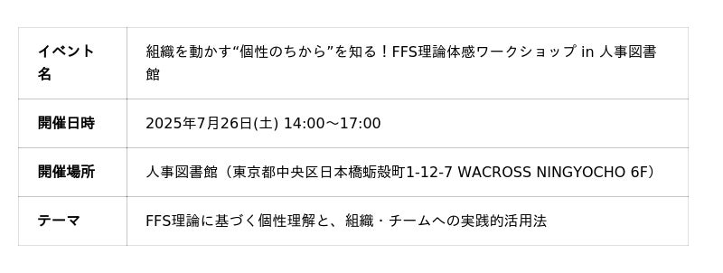 株式会社Trustyyle(本社:東京都中央区・代表取締役:吉田洋介)は、2025年7月26日に「組織を動かす“個性のちから”を知る!FFS理論体感ワークショップ in 人事図書館」を運営するコミュニティ「人事図書館」にて開催しました。relate株式会社の坂井啓悦氏、服部穂住氏らによるFFS理論に関する講演や参加者自身の診断結果を用いた体感型ワークショップが行われ、盛況のうちに終了しました。本記事では、イベント当日の様子や成果についてご報告します。