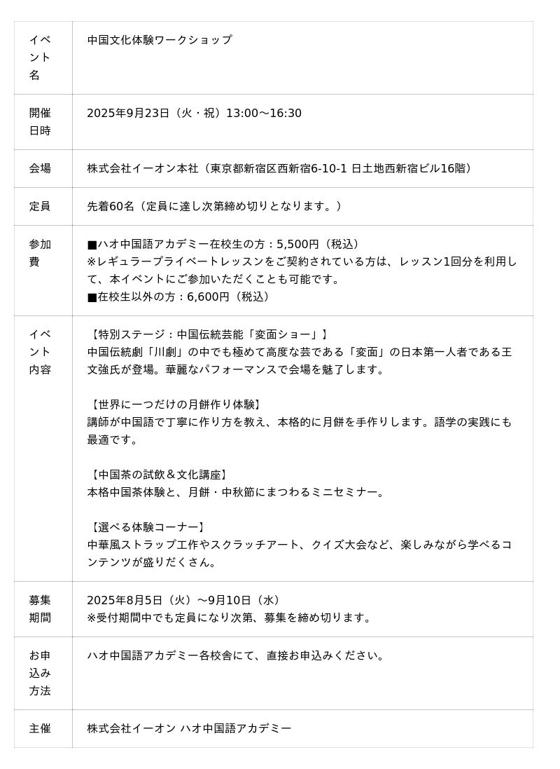 株式会社イーオン(本社:東京都新宿区、代表取締役社長:重野卓、以下「イーオン」)が運営するハオ中国語アカデミーは、2025年9月23日(火・祝)に、中秋節をテーマにした特別イベント「中国文化体験ワークショップ」を開催いたします。本ワークショップは、中国の伝統文化や言語に親しむことを目的とし、ハオ中国語アカデミー在校生の方のみならず、在校生以外の中国語学習者のみなさまにも広くご参加いただける内容となっています。