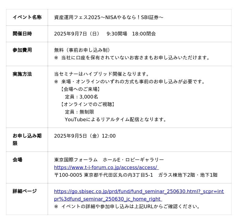株式会社SBI証券(本社:東京都港区、代表取締役社長:高村正人、以下「当社」)は、ハイブリッド型(会場+オンライン中継)イベント「資産運用フェス2025~NISAやるなら!SBI証券~」を2025年9月7日(日)に東京国際フォーラムにて開催しますのでお知らせします。