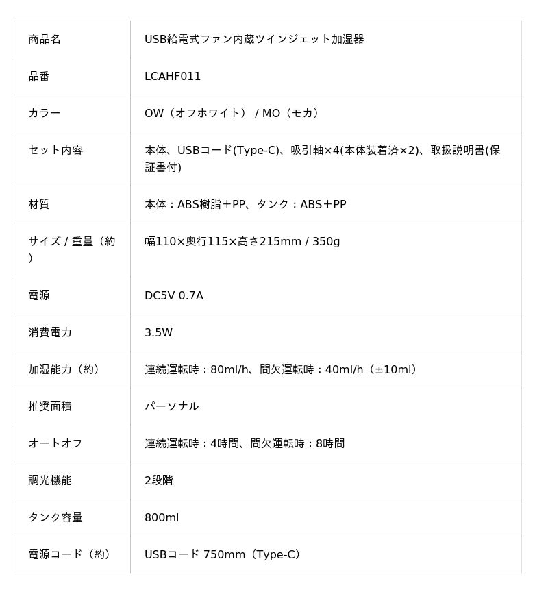 「USB給電式ファン内蔵ツインジェット加湿器」 LCAHF011
