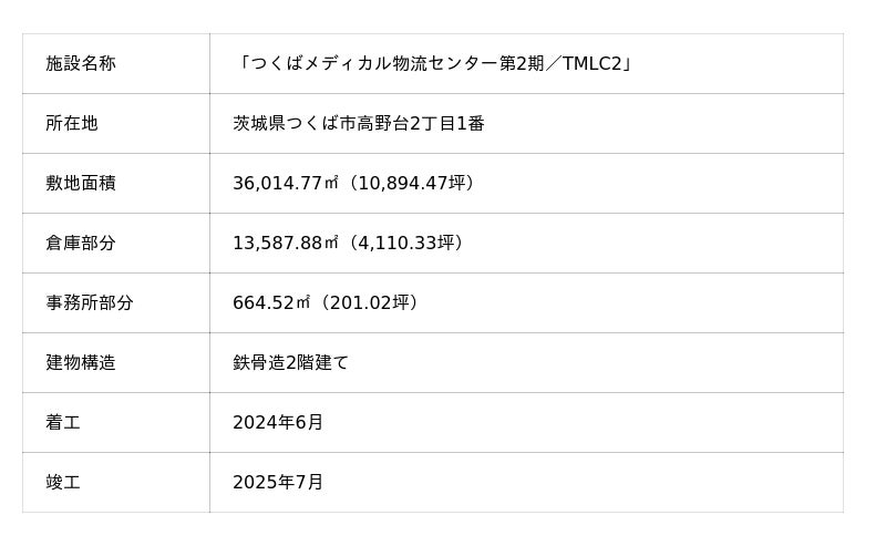 「つくばメディカル物流センター第2期/TMLC2」は、伊藤忠ロジスティクス株式会社と沼尻産業株式会社の共同開発物件であり、2022年4月に竣工したTMLCに続き、つくばで2拠点目のメディカル専用物流倉庫です。 (TMLC含め21,380平方メートル )