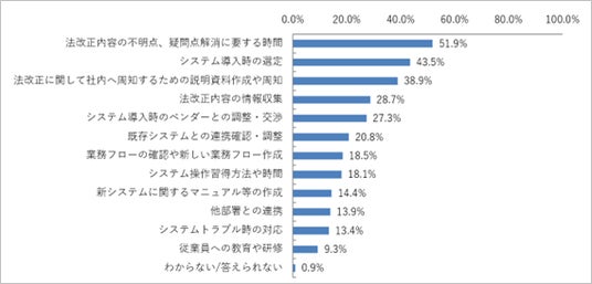 その具体的な負担として最も多く挙げられたのは、「法改正内容の不明点、疑問点解消に要する時間」(51.9%)でした。次いで、「システム導入時の選定」(43.5%)、「法改正に関して社内へ周知するための説明資料作成や周知」(38.9%)が上位を占めています。これらの結果は、単に新しいルールやシステムに対応するだけでなく、その「理解」「選定」「社内への浸透」といったプロセス自体が、経理担当者にとって大きな時間的・精神的負担となっていることを示唆しています。