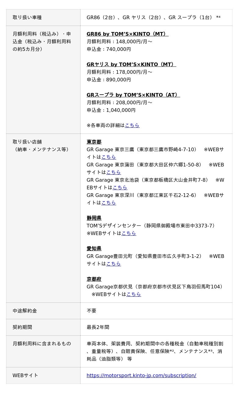 5台限定でのご提供となり、本日から抽選受付を開始します。KINTOとTOM’Sが手がけたスポーツカーで、日常のドライブから週末のサーキット走行まで、じっくりとカーライフを楽しみたい方はぜひご応募ください。