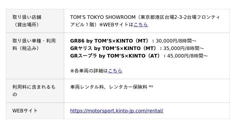 まずは、東京都のTOM‘S TOKYO SHOWROOMでの貸し出しとなりますが、将来的には別地域での貸し出しも検討しています。