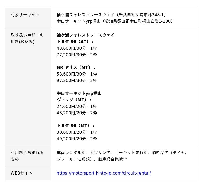 まずは、千葉県の袖ケ浦フォレストレースウェイ、愛知県の幸田サーキットyrp桐山でのサービス提供からスタートします。両サーキットは、これまで現地での走行申し込みが必要でしたが、本サービスにおいては、本サービスのWEBサイトからの予約が可能なため、よりフレキシブルなスケジューリングが可能です。