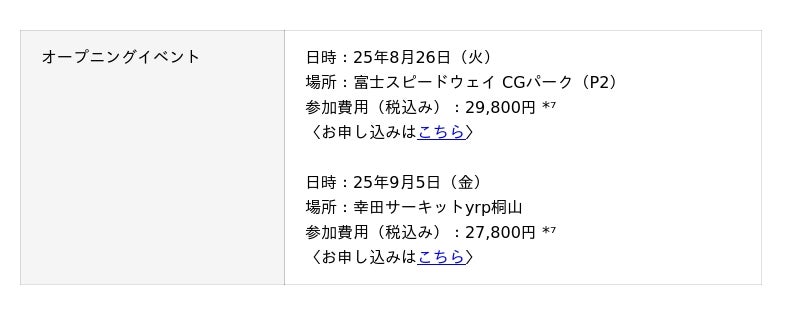 「サーキットで走ってみたい」「プロドライバーに教えてもらいたい」「サーキットで腕を磨きたい」といったお客様には、走行・体験イベントもご用意。まずは、8月・9月に「サーキットレンタル」サービスでご利用いただける車両や「レンタカー」サービスでご利用いただけるチューンアップされたスポーツカーにお乗りいただけるオープニングイベントを開催します。モータースポーツにご興味をお持ちの方ならどなたでも参加可能なイベントとなりますので、ぜひ奮ってご応募ください。