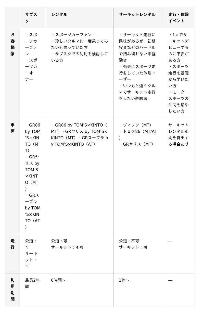 本サービスでは、チューンアップ*¹されたこだわりのハイスペックなスポーツカーに最長2年間お乗りいただける「サブスク」、サブスクで取り扱うハイスペックなスポーツカーを8時間からお借りいただける「レンタル」、手軽にサーキット走行をお楽しみいただける「サーキットレンタル」、モータースポーツ初心者の方やインストラクターに教わりながらスポーツ走行を楽しみたい方に向けた「走行・体験イベント」の4つのサービスを通じて、憧れのスポーツドライビングやサーキット走行をお客様のスタイルに合わせて身近に体験できる機会を提供します。