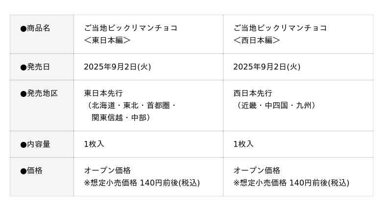 株式会社ロッテ(東京都新宿区、代表取締役社長執行役員:中島英樹、以下ロッテ)は、2025年9月2日(火)に、「ご当地ビックリマンチョコ<東日本編>」と「ご当地ビックリマンチョコ<西日本編>」を東西エリアにて先行で2品同時発売いたします。80年代後半に社会現象を巻き起こした悪魔VS天使シリーズの40周年記念商品のファイナルとなる本商品は、ビックリマン史上初となる「ご当地」をテーマに、47都道府県別のビックリマンキャラクターのシールがお楽しみいただけます。“集める楽しさ”と“地域の魅力”が融合した、これまでにない新しいビックリマン体験を、ぜひお楽しみください!