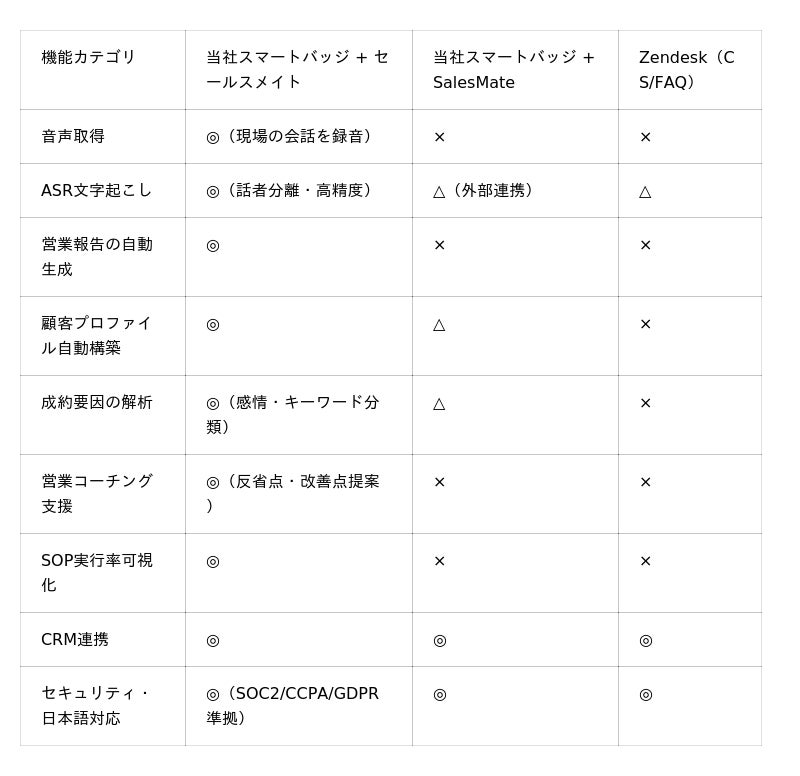 AIスマートバッジ + SalesMateは、従来のCRM/SFAツールでは取得できなかった「現場会話の一次情報」を軸に全営業活動を自動化します。