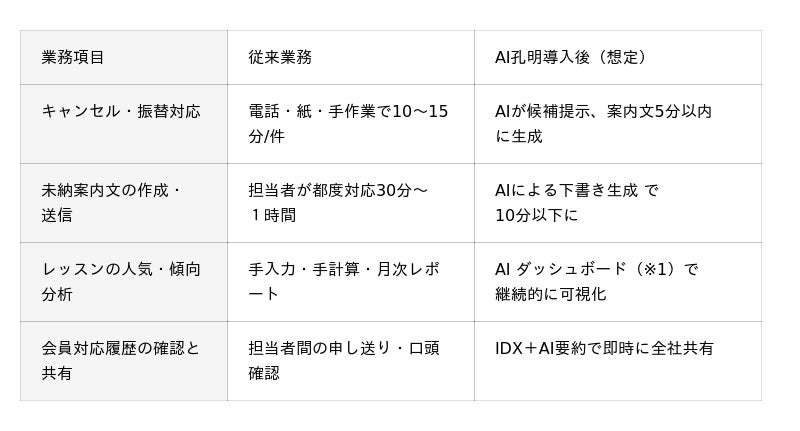 - 予約・キャンセル・振替処理が手作業・属人的- 会員の利用傾向や退会リスクが可視化できていない