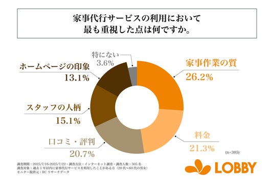 また、「家事代行サービスの利用において最も重視した点」を尋ねる設問への回答では、1位が「家事作業の質」で26.2%、2位が「料金」で21.3%、3位が「口コミ・評判」で20.7%という結果になりました。この結果から、家事代行サービスの利用において最も重視した点は、「家事作業の質」であることが明らかになりました。