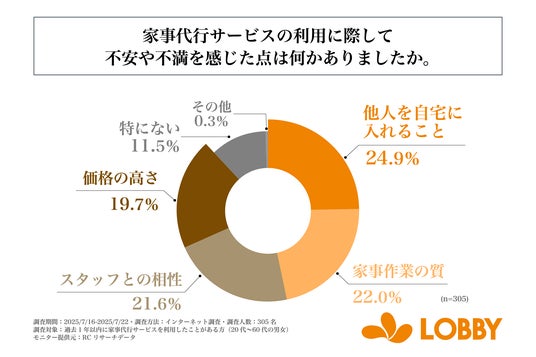 次に、「家事代行サービスの利用に際して不安や不満を感じた点」を尋ねる設問への回答では、1位が「他人を自宅に入れること」で24.9%、2位が「家事作業の質」で22.0%、3位が「スタッフとの相性」で21.6%という結果になりました。この結果から、家事代行サービスの利用の際に主に不安や不満を感じた点は、「他人を自宅に入れること」や「家事作業の質」であることがわかりました。