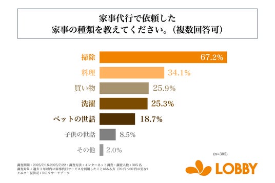株式会社ロビー(本社:東京都新宿区、代表取締役:対馬 誉仁)が運営する「LOBBY」は、は、過去1年以内に家事代行サービスを利用したことがある方(20代~60代の男女)を対象に「家事代行サービスの利用実態」に関する調査を実施しました。この調査から、家事代行の利用頻度や利用したきっかけ、代行してもらっている家事の種類などが明らかになりました。