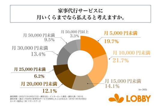 調査の最後、「家事代行サービスに月いくらまでなら払えるか」を尋ねる設問への回答では、1位が「月10,000円未満」で21.7%、2位が「月5,000円未満」で19.7%、3位が「月15,000円未満」で14.1%という結果になりました。本調査結果を見ると、月10,000円未満という層が約4割いる一方、月20,000円以上という層も3割以上いることから、家事代行サービスに月に払える金額は人によって様々であることが明らかになりました。