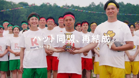 新CMでは、帽子と小屋の形をした雲が浮かぶ青空のもと、イエローハットとリンガーハットの社員が「ハットマンシップ」に則り正々堂々とたたかうことを宣誓するシーンからスタート。そこにハトのマークの引越センターの社員が突如現れ、「ハトマンシップ」に則って参加したいと告げるシーンから運動会の幕が上がります。