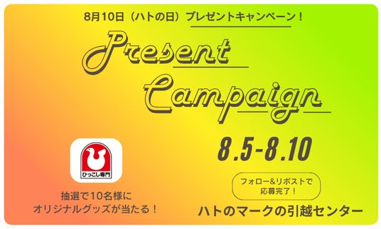 8月5日(火)~8月10日(日)に、「フォロー&リポストキャンペーン」を実施。ハトのマークの引越センターX公式アカウントをフォローし、対象投稿をリポストすると、抽選で10名様に「ハトのマークオリジナルグッズ」が当たります。