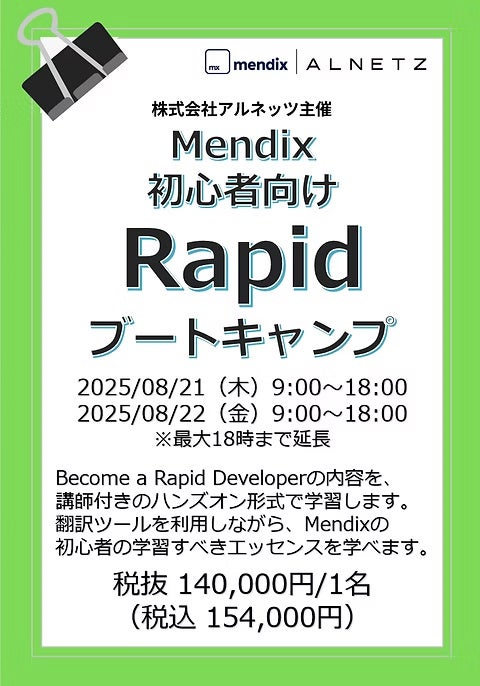 「Become a Rapid Developer」の内容を基に、Mendixを使ったローコード開発を実践的に学べる初心者向けウェビナーです。講師付きのハンズオン形式で進行し、Mendixの基本から実務に必要な開発エッセンスまで学べます。さらに、Mendix Rapid Developer認定資格の取得を目指す準備もできる内容です。
