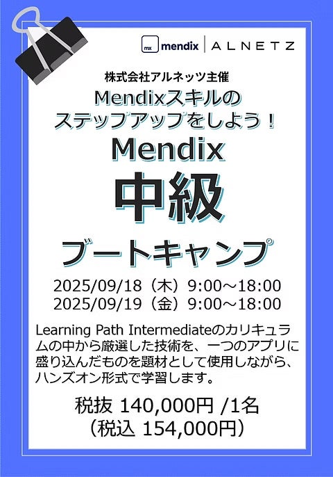 Mendix 中級ブートキャンプ中級者向けのMendixブートキャンプでは、Learning Path Intermediateの厳選された技術を学べます。一つのアプリを題材として、実践的なスキルをハンズオンで身につけ、Mendixを使った開発力をステップアップさせましょう。