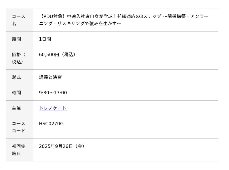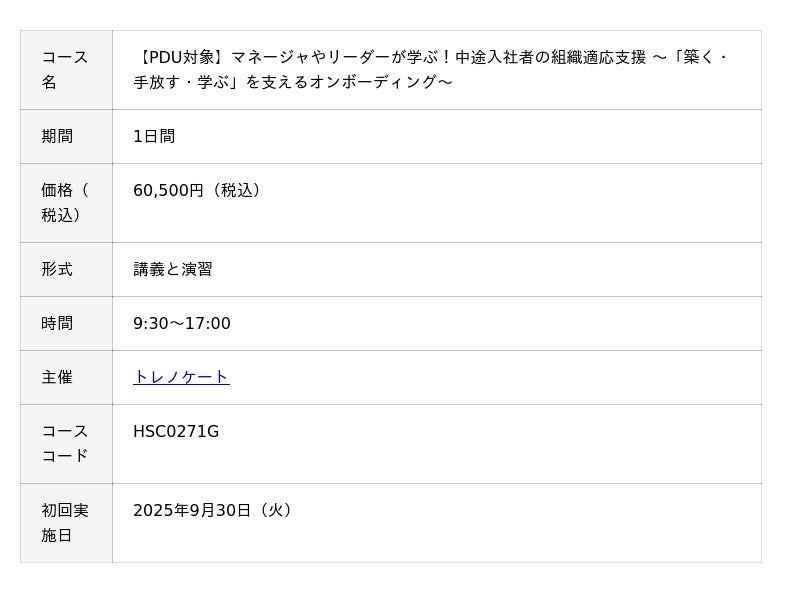 人材育成のトレノケート株式会社(本社:東京都新宿区、代表取締役社長:早津 昌夫)は、中途採用における組織適応課題の解決を目的とした新研修コース2種「【PDU対象】中途入社者自身が学ぶ!組織適応の3ステップ ~関係構築・アンラーニング・リスキリングで強みを生かす~」および「【PDU対象】マネージャやリーダーが学ぶ!中途入社者の組織適応支援 ~「築く・手放す・学ぶ」を支えるオンボーディング~」の提供を開始しました。