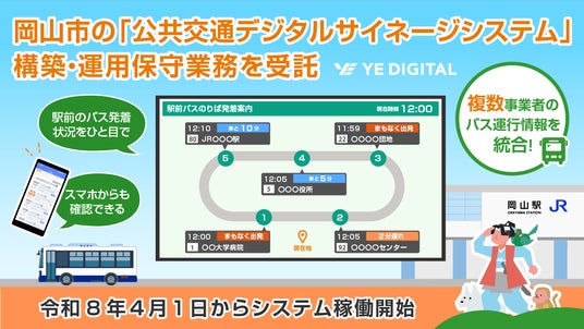 株式会社YE DIGITAL(本社:福岡県北九州市、代表取締役社長:玉井裕治、以下 YEデジタル)は、岡山県岡山市が公示した一般競争入札案件「公共交通デジタルサイネージシステム構築・運用保守業務委託」(契約番号:2025011611-00)において、落札者として選定されました。