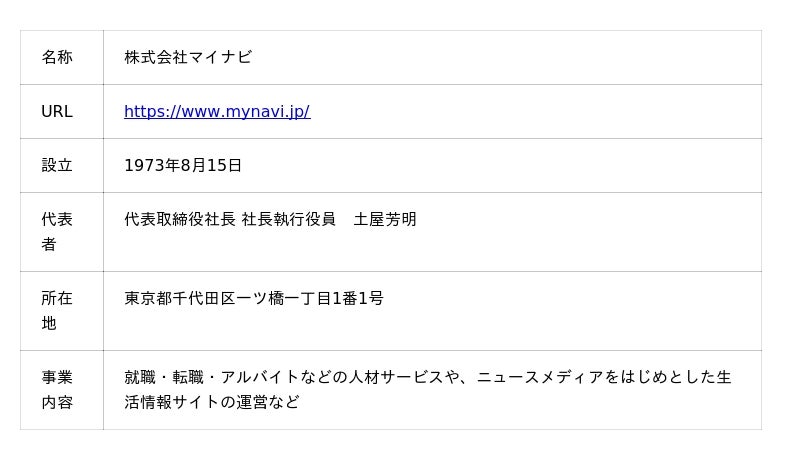 株式会社マイナビは、「一人ひとりの可能性と向き合い、未来が見える世界をつくる。」をパーパスに掲げ、人々の人生に寄り添い、サポートする多様な事業を展開しています。人材ビジネスや生活情報メディアを通して、ユーザーの可能性を広げ、新しい未来が見えるようなサービスを提供いたします。