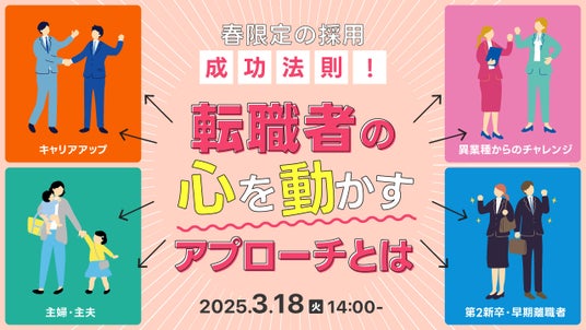 本セミナーでは、転職者の心に響く採用アプローチをテーマに、中途採用市場が活発になる春の好機を最大限に活かすための効果的な手法と最新の成功事例を詳しく解説します。