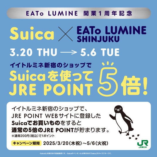 Suicaを使ってJRE POINT5倍!1周年の感謝の気持ちを込めて、イイトルミネ新宿のショップでJRE POINT WEBサイトに登録したSuicaでお買いものをすると、通常の5倍のJRE POINTが貯まるキャンペーンを実施します!この機会にイイトルミネ新宿でお得にJRE POINTを貯めよう!
