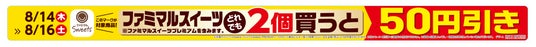 8月14日(木)から8月16日(土)の3日間はファミマルスイーツを2個お買い上げいただくごとに50円引きとなるセールを開催いたします。