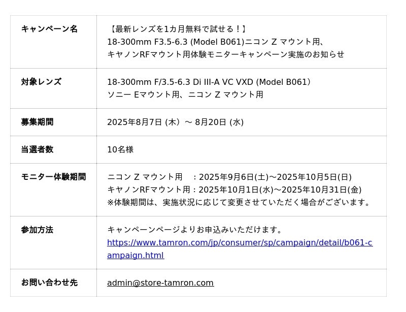 総合光学機器メーカーの株式会社タムロン(本社:さいたま市)は、APS-Cミラーレス一眼カメラ対応ニコン Z マウント用、キヤノンRFマウント用高倍率ズームレンズ「18-300mm F/3.5-6.3 Di III-A VC VXD (Model B061)」の発売を記念して、体験モニターキャンペーンを実施いたします。